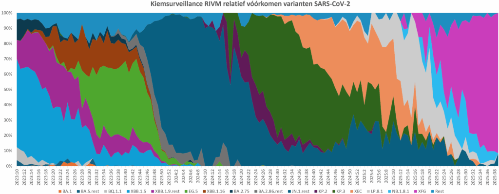 In week 38 met 114 geteste monsters blijkt variant XFG (ook wel “Stratus” genoemd) met 89,5% ruim dominant te zijn, gevolgd door NB.1.8.1 (“Nimbus”) met 6,1%. Kennelijk heeft het RIVM in de forse coronagolf geen problemen meer om voldoende testsamples binnen te krijgen.