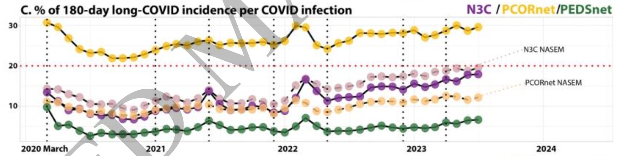 In februari van dit jaar is een meta-analyse gepubliceerd naar de prevalentie van Long Covid in verschillende nationale netwerken van de gezondheidszorg in de VS. Dat leverde grafieken op als de onderstaande, waarbij het aantal geregistreerde LongCovid-patiënten tot ver in 2023 is blijven stijgen, en 10-30% van de bevolking LongCovid-gerelateerde klachten had.