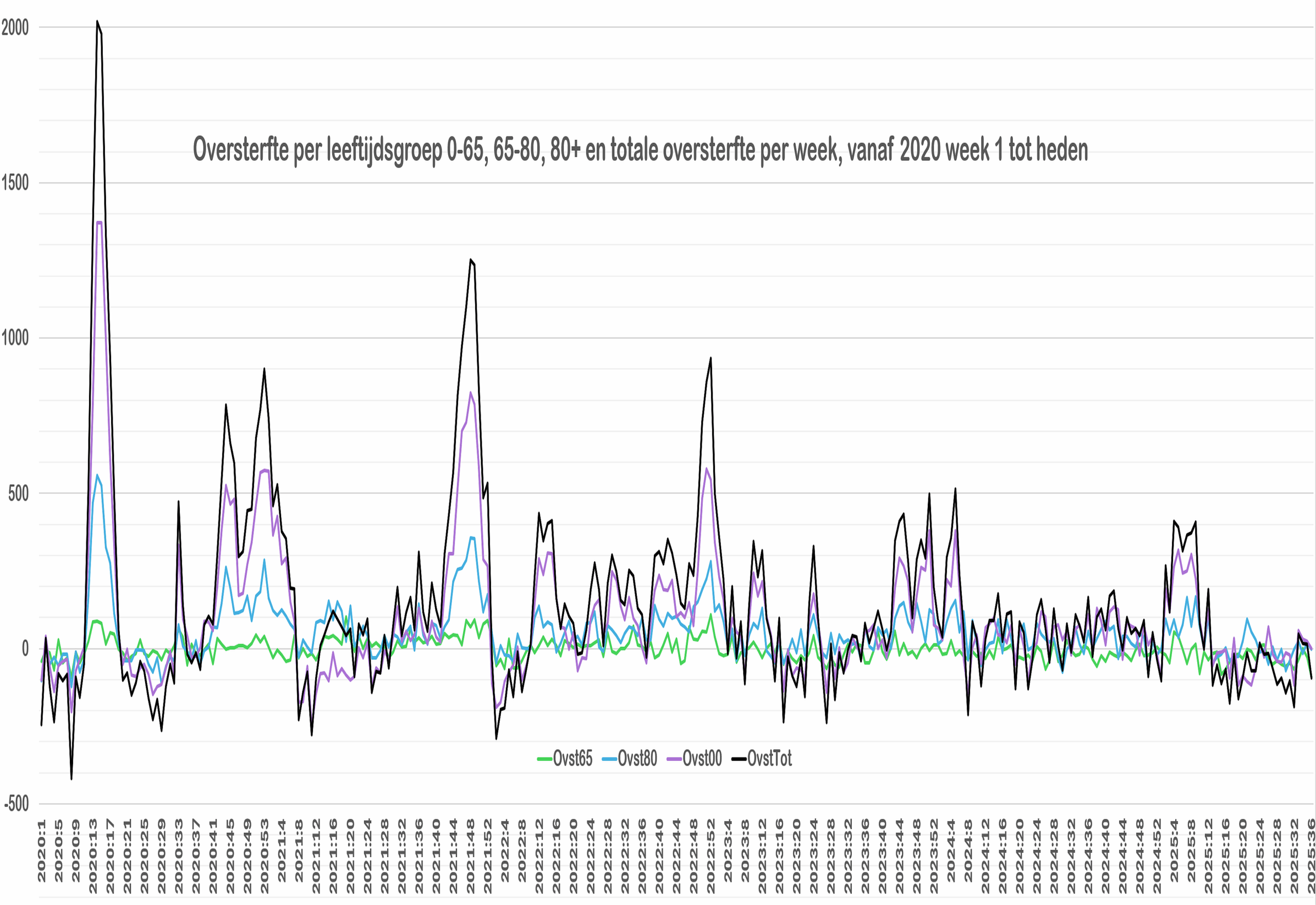 Normaal gesproken publiceert het CBS elke 2 weken de weeksterftecijfers voor de leeftijdgroepen 0-65, 65-80 en 80+, gesplitst in mannen en vrouwen. Deze week zouden de cijfers voor week 38 bekend moeten zijn, maar helaas heeft het CBS verstek laten gaan deze keer. Daarom laten we de berekening van oversterfte deze keer achterwege. Hieronder wordt alleen het verloop van de oversterfte volgens de ASMR-methode herhaald t/m week 36, voor alle weken van in periode 2020-2025, uitgesplitst naar de 3 leeftijdsgroepen 0-65, 65-80 en 80+, en natuurlijk de totale oversterfte als som van die drie.