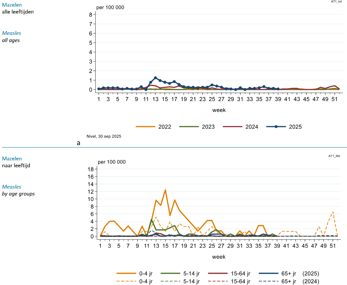 Na de heftige uitbraak van kinkhoest in 2024, ook al zo’n vergeten infectieziekte die sinds de coronapandemie weer helemaal terug is, hebben we de verspreiding van deze akelige “honderd dagen hoest” een tijdje gevolgd in deze weekberichten. De ziekte leek weer bedwongen. Maar sinds week 37 is weer een lichte verhoging zichtbaar, dus we blijven dit kritisch volgen. Kinkhoest is vooral voor jonge kinderen levensgevaarlijk en door de antivax verhalen worden helaas minder baby’s gevaccineerd.