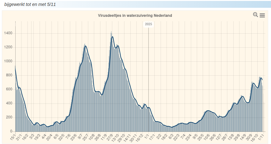 Op 28 oktober werden er 660 x10e11 virusdeeltjes per 100 duizend inwoners in het riool gevonden (grafiek hieronder van corona-lokaal.nl). Dit stemt overeen met ongeveer 24 duizend besmettingen.