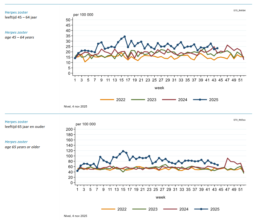 Het aantal Nederlanders dat met gordelroos naar de huisarts gaat, is iets verhoogd onder de 65 jaar en nog steeds duidelijk verhoogd boven de 65 jaar.