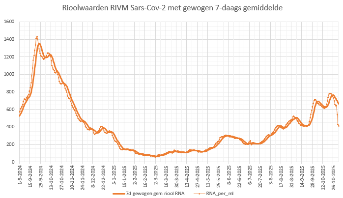 De grafiek van Roel Griffioen op Mastodon (hieronder) laat ook een recente daling zien. De tekst op Mastodon geeft aan dat gegevens tot en met 2 november zijn gebruikt, waarbij de data van de laatste drie dagen weinig betrouwbaar zijn.
