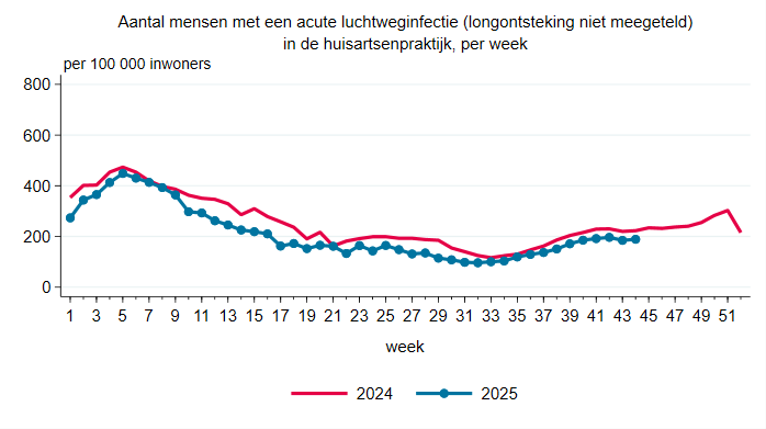 Het aantal mensen dat de huisarts bezoekt voor een luchtweginfectie neemt een klein beetje toe.