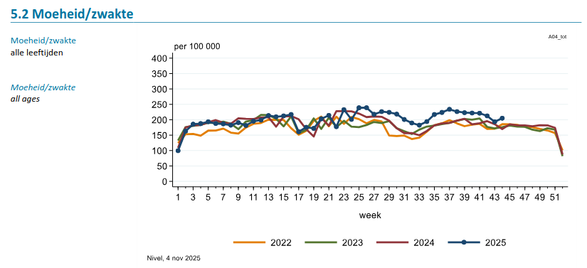 Het aantal huisartsbezoeken voor moeheid en zwakte zit nu weer iets boven de aantallen van de vorige jaren.