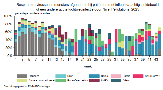 De meest voorkomende virussen in de monsters van de infectieradar blijven het rhinovirus en SARS-Cov2 (alleen deze twee zijn weergegeven in de grafiek hieronder).
