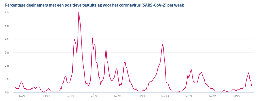 Ook het aandeel deelnemers met een positieve test daalt, naar een waarde van 0,5%.