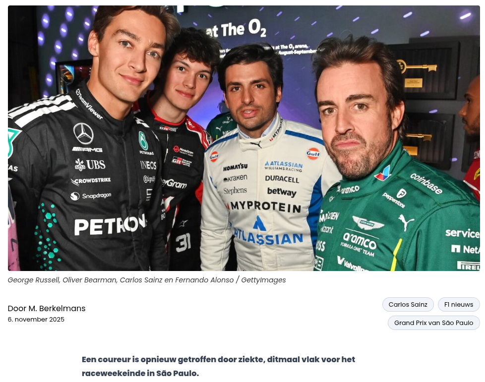 Bij de formule 1 was Carlos Sainz ziek. De tekst onder de foto spreekt van “opnieuw”, maar het is niet duidelijk wie hem voorging. Blijkbaar is veel sporten niet voldoende om niet ziek te worden.