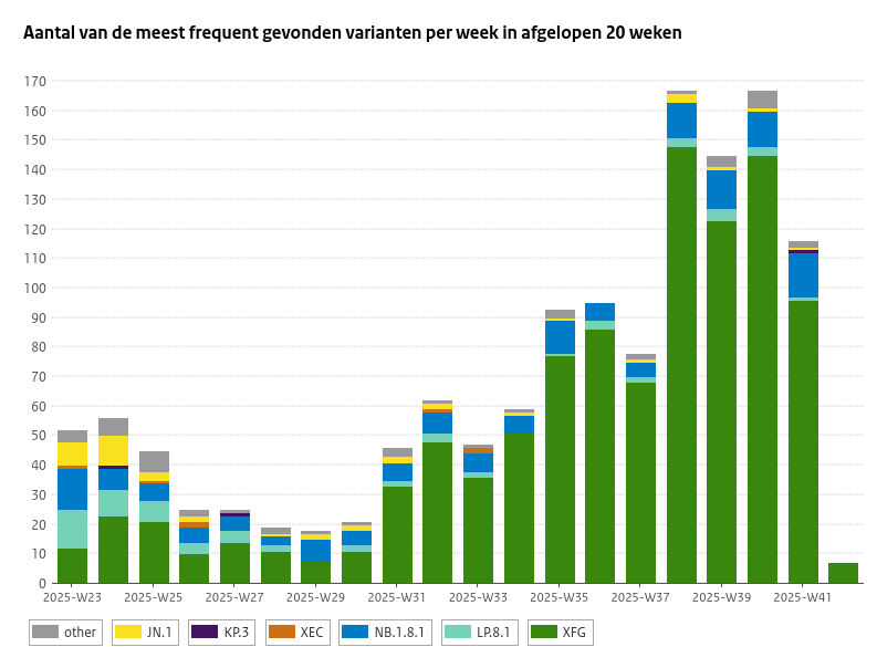 Bij de varianten blijft XFG dominant (grafiek hieronder van het RIVM).