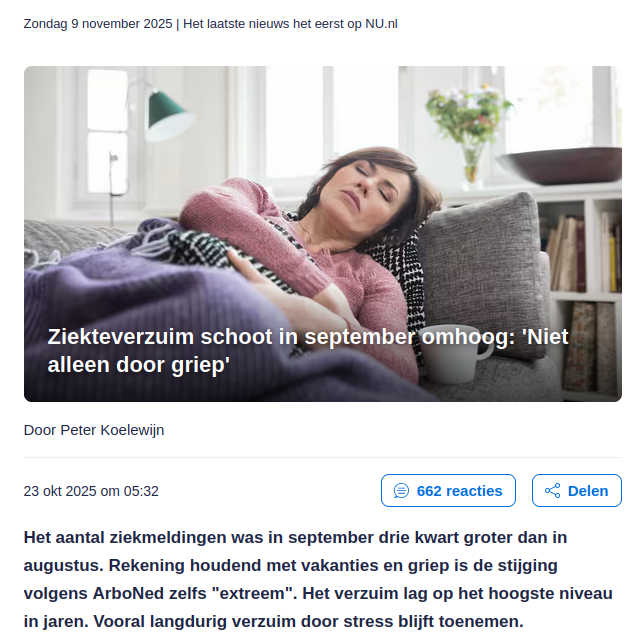 Het hoge ziekteverzuim in Nederland, België, het VK, en eerder ook Duitsland geeft aan dat de beroepsbevolking nog steeds zieker is dan voor de pandemie. Het idee van het inhalen van infecties lijkt dus niet te werken. De suggestie wordt gewekt dat het ziekteverzuim vooral komt door de griep, stress, of dat het te makkelijk is om jezelf ziek te melden. Eerder zagen we ook dat een ondernemer geen uitkering kon krijgen voor long Covid, maar wel voor depressie. Het idee dat long Covid bijna niet meer voorkomt, kan dus het gevolg zijn van dat alles nu griep, stress, depressie en mentale stoornissen wordt genoemd. Het verkorten van uitkeringen en het moeilijker maken van het aanvragen van een uitkering zal mensen niet opeens gezonder maken.