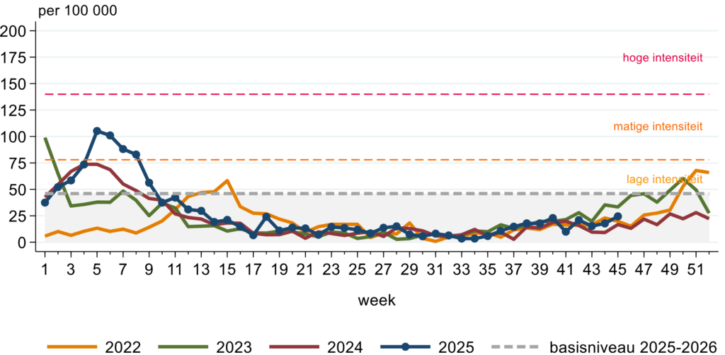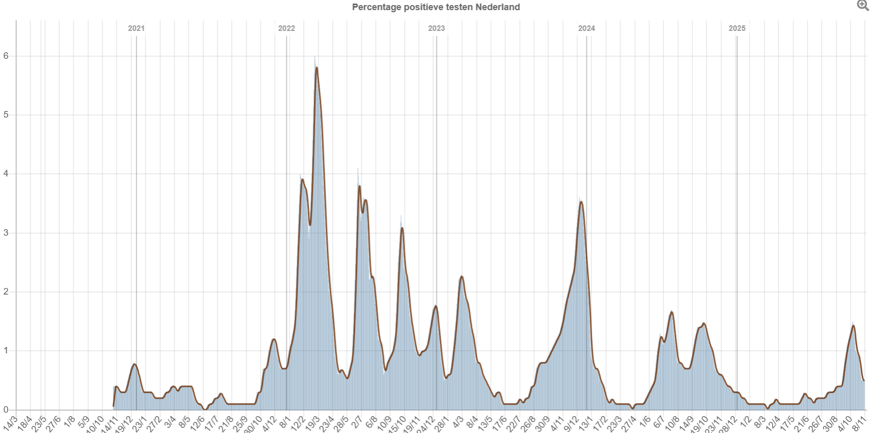 Het percentage mensen met klachten van acute luchtweginfecties, o.b.v. meldingen door een groep vrijwilligers aan het RIVM, geeft op elk moment een idee van het besmettingsrisico op rondgaande respiratoire infecties. Op 8 november rapporteerde 6,0% van de testgroep RIVM een luchtweginfectie aan het RIVM (voortschrijdend weekgemiddelde). De piek van 9% in week 38 is gelukkig achter de rug, maar als we vergelijken met voorgaande jaren dan ligt een nieuwe winterpiek, met bijvoorbeeld de voorspelde influenzagolf, in het verschiet.