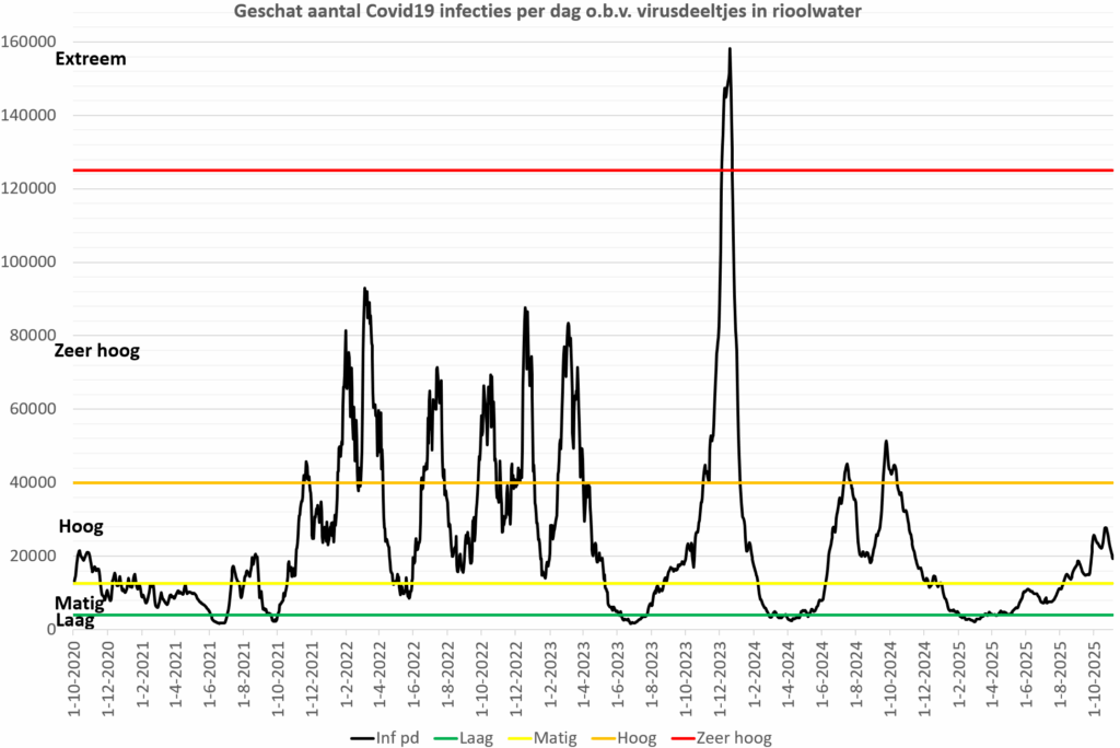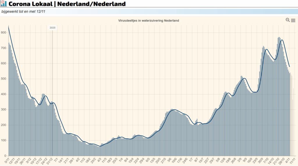 N.B. Het aantal rioolwaterzuiveringen waar corona-virusdeeltjes worden gemeten is vanaf 7 juli 2025 door RIVM teruggebracht van 311 naar 132, en de meetfrequentie werd 1x per week. Hierdoor liggen de meest recente betrouwbare meetgegevens tegenwoordig ca. 2 weken in het verleden. Wij gebruiken alleen metingen met gegevens van RWZI verzorgingsgebieden met in totaal tenminste 10 miljoen inwoners.