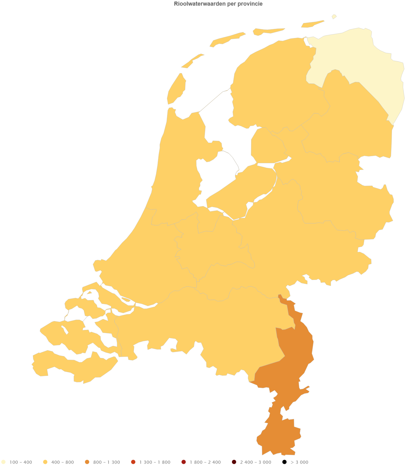 Op Corona Lokaal is ook de landelijke spreiding van het coronavirus te zien, over de provincies en over de afvalwaterstations. Heel Nederland, behalve Groningen, is nu ten minste donkergeel gekleurd (rioolwaarde tussen 400 en 800), terwijl Limburg zelfs bruingekleurd is (800-1300), voor het eerst dit jaar!
