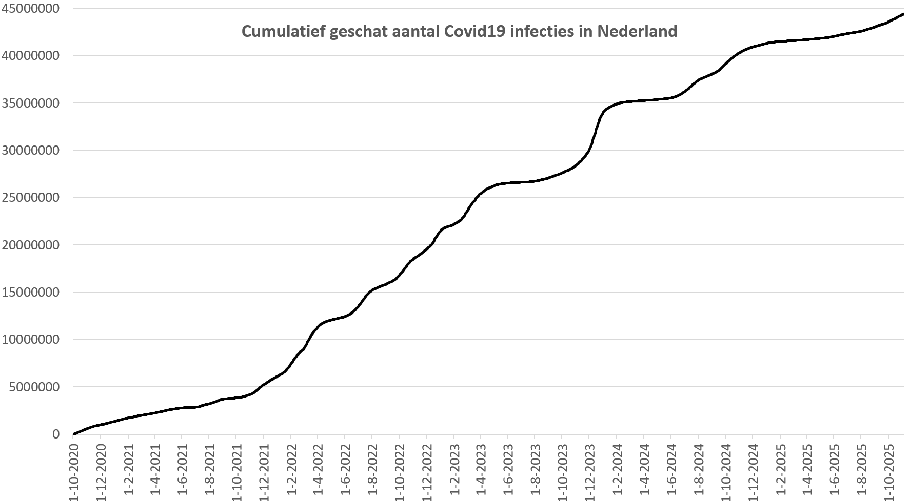 Op 4 november was het geschatte aantal besmettingen per dag ruim 19.300. In de voorafgaande week zouden er in totaal bijna 146.000 mensen besmet zijn, waarvan ruim 15.000 naar verwachting langer dan 3 maanden klachten zullen houden, Long Covid dus. Zo’n 3700 daarvan zullen ernstig beperkt worden in hun dagelijks leven en werk.