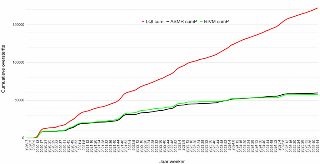 In onderstaande grafiek tenslotte hebben we de cumulatief positieve oversterfte van 2020-2025 uitgezet voor LQI, ASMR en RIVM, dat is de totale oversterfte vanaf week 12 waarbij tijdelijke ondersterfte genegeerd wordt. De totale oversterfte voor LQI is al opgelopen 172.288, voor een groot deel te wijten aan de vergrijzing. De grafieken voor ASMR en RIVM lijken elkaar niet veel te ontlopen, maar het verschil zal in de loop van de jaren ongetwijfeld steeds verder oplopen.