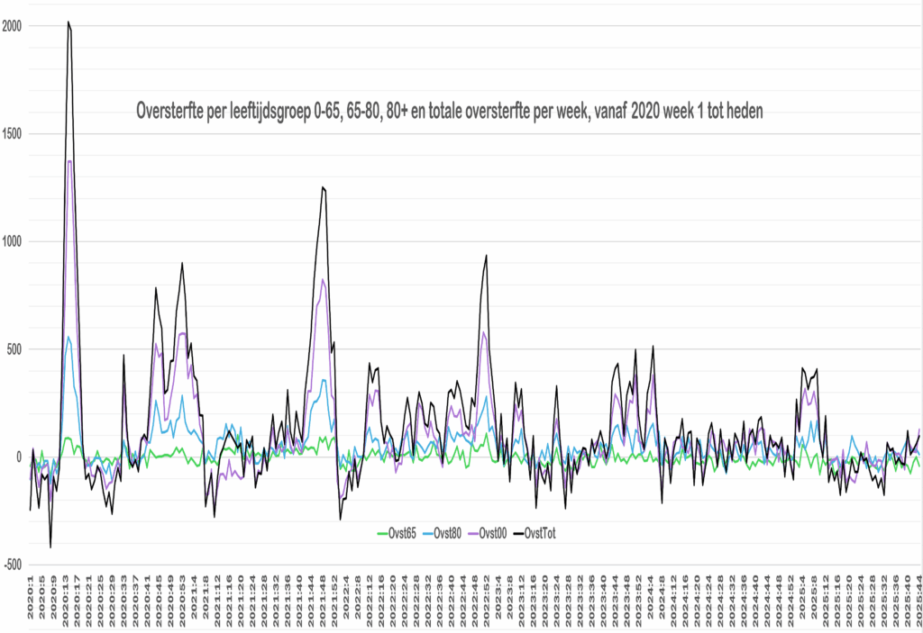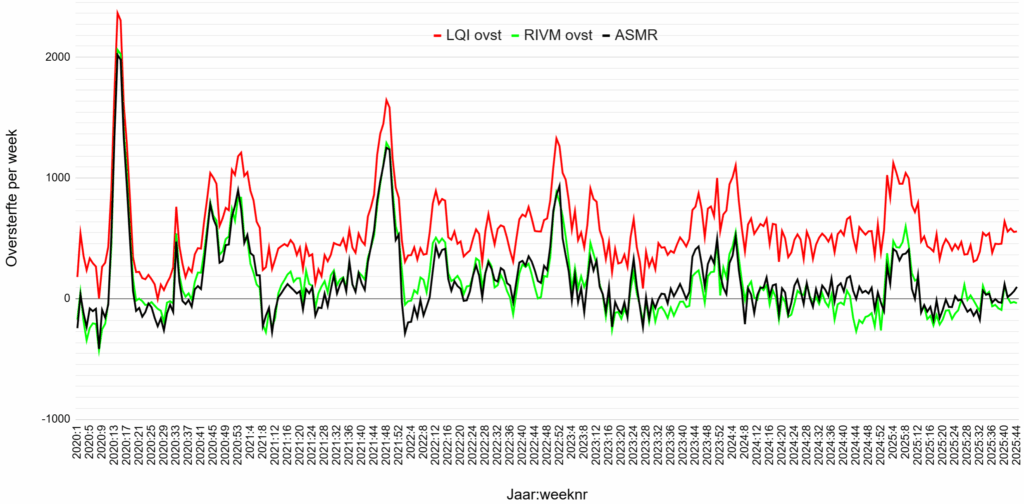 De RIVM-oversterfte is niet gevoelig voor de effecten van de vergrijzing, omdat de sterfte vergeleken wordt met de verwachte sterfte o.b.v. de voorafgaande 5 jaar, dus inclusief coronasterfte. We zien dan ook dat er belangrijke verschillen optreden tussen ASMR en RIVM, vooral in perioden dat er veel covid rondgaat. Zoals in de herfst van 2024 en 2025 het geval was.
