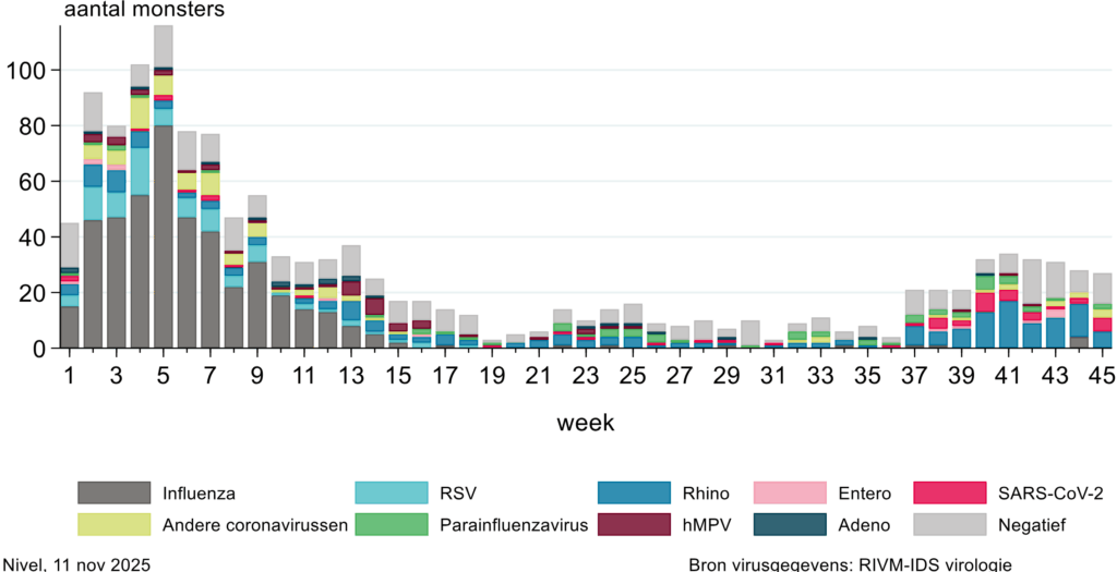 In het Nivel Surveillance Bulletin van week 45 in 2025 wordt de status van veel infectieziektes in Nederland belicht. Het aantal afgenomen monsters van respiratoire infecties was in week 45 weer wat hoger dan afgelopen zomer: 27 monsters waarvan 16 positief. SARS-CoV-2 werd 5 keer aangetroffen, het Rhinovirus 6 keer, terwijl er geen Influenzavirus gevonden werd.
