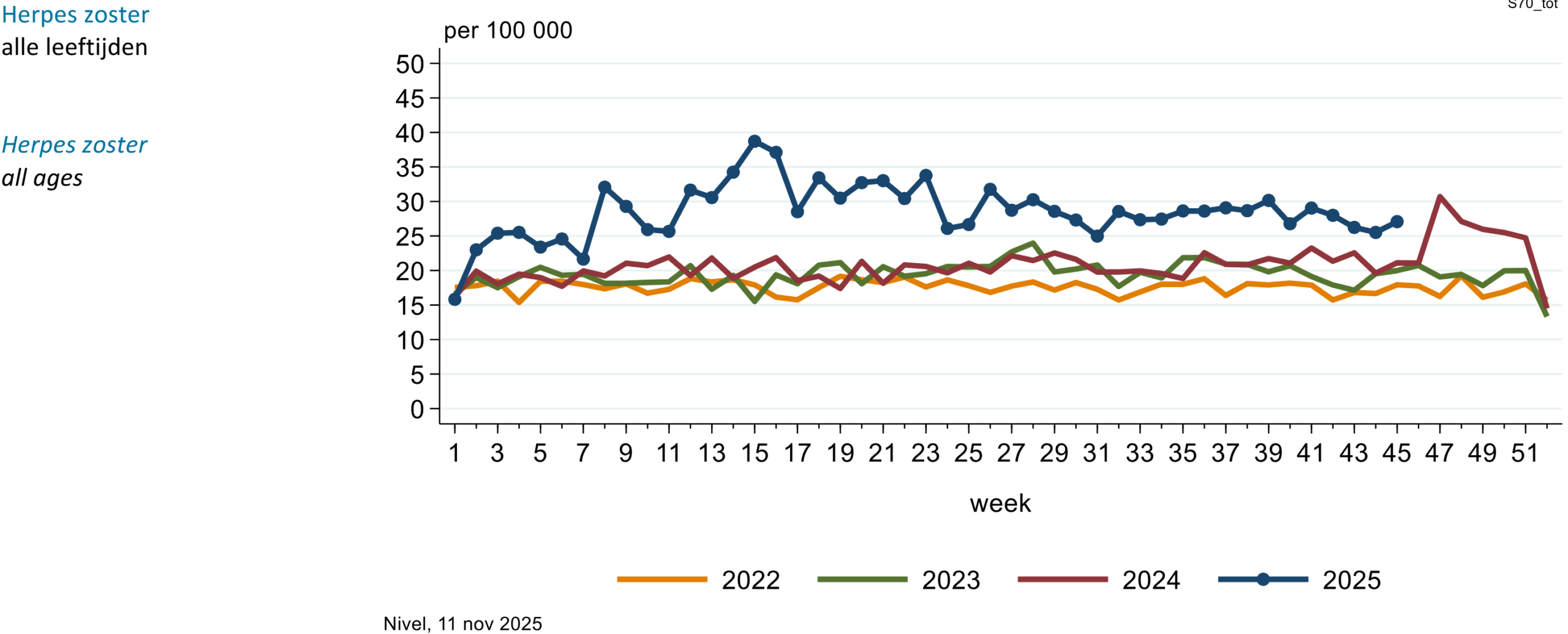 Het Nivel heeft in 27 monsters behalve SARS-CoV-2 veel Rhinovirus gevonden en wat Parainfluenzavirus, maar nog geen influenza. Het aantal patiënten met een influenza-achtig ziektebeeld is nog laag, maar stijgt wel iets. In het VK echter heeft influenza een vliegende start gekregen, dus de verwachtingen zijn in NL niet gunstig. Verder meldt het Nivel het hele jaar al sterk verhoogde aantallen patiënten met gordelroos (herpes zoster) bij de groep 65+. Het is bekend dat een Covid19 besmetting het varicella zoster virus kan reactiveren.
