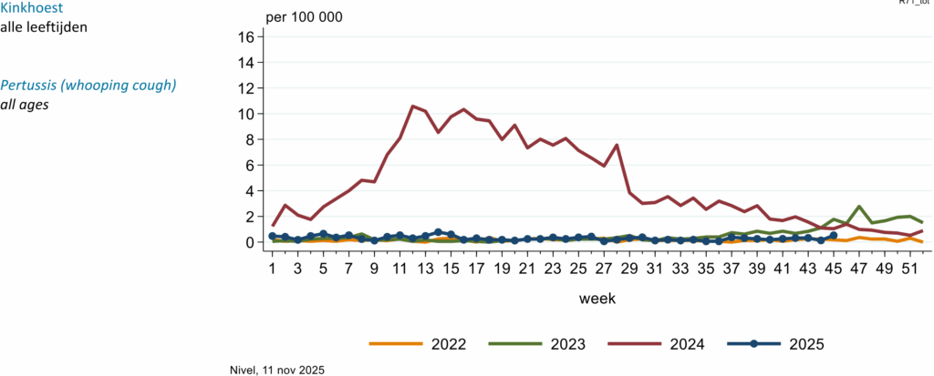 Na de heftige uitbraak van kinkhoest in 2024, ook al zo’n vergeten infectieziekte die sinds de coronapandemie weer helemaal terug is, hebben we de verspreiding van deze akelige “honderd dagen hoest” kritisch gevolgd in deze weekberichten. De ziekte leek weer bedwongen. Maar in week 45 is toch weer een lichte verhoging zichtbaar. Kinkhoest is vooral voor jonge kinderen levensgevaarlijk en door de antivaxverhalen worden helaas minder baby’s gevaccineerd.