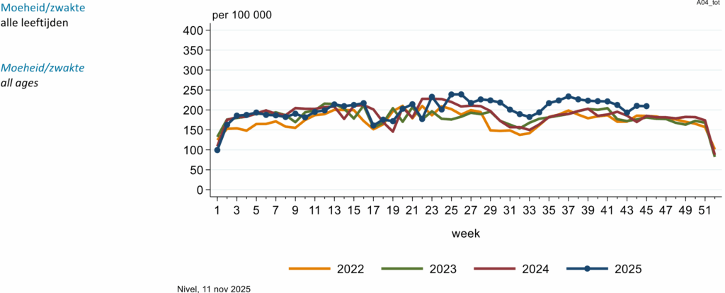 Het aantal patiënten met moeheid en zwakte is in jaren niet zo hoog geweest, sinds het begin van de zomer tot 30% hoger dan normaal. Dit is eenvoudig te verklaren door toename van het aantal patiënten met Long Covid, immers covid gaat tegenwoordig het hele jaar door, terwijl niemand meer test noch aan preventie doet. Toch wordt in Nederland die link nooit gelegd.