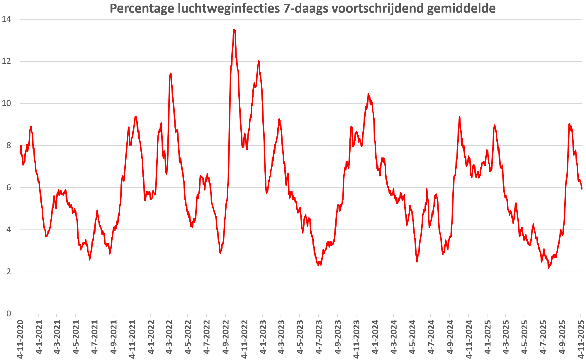 Volgens RIVM infectieradar is het aantal luchtweginfecties in het algemeen afgenomen na een scherpe piek van 9% in oktober.