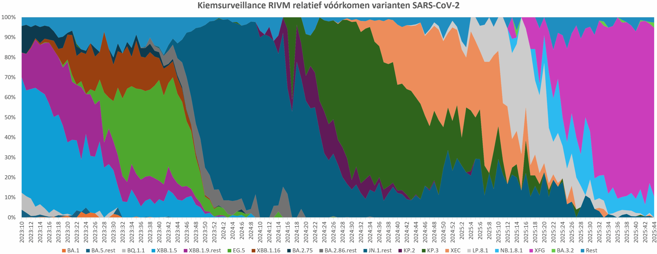 Variant BA.3.2 is wel terug te vinden in onderstaande grafiek met de ontwikkelingen vanaf 2023 week 10 t/m 2025 week 44, omdat in de RIVM dataset nog steeds getest werd op BA.3. In week 44 had BA.3.2 een aandeel van 2,6%. We zullen die variant daarom goed in de gaten houden, want die zou wel eens een goede kandidaat kunnen zijn voor de wintergolf van 2026.