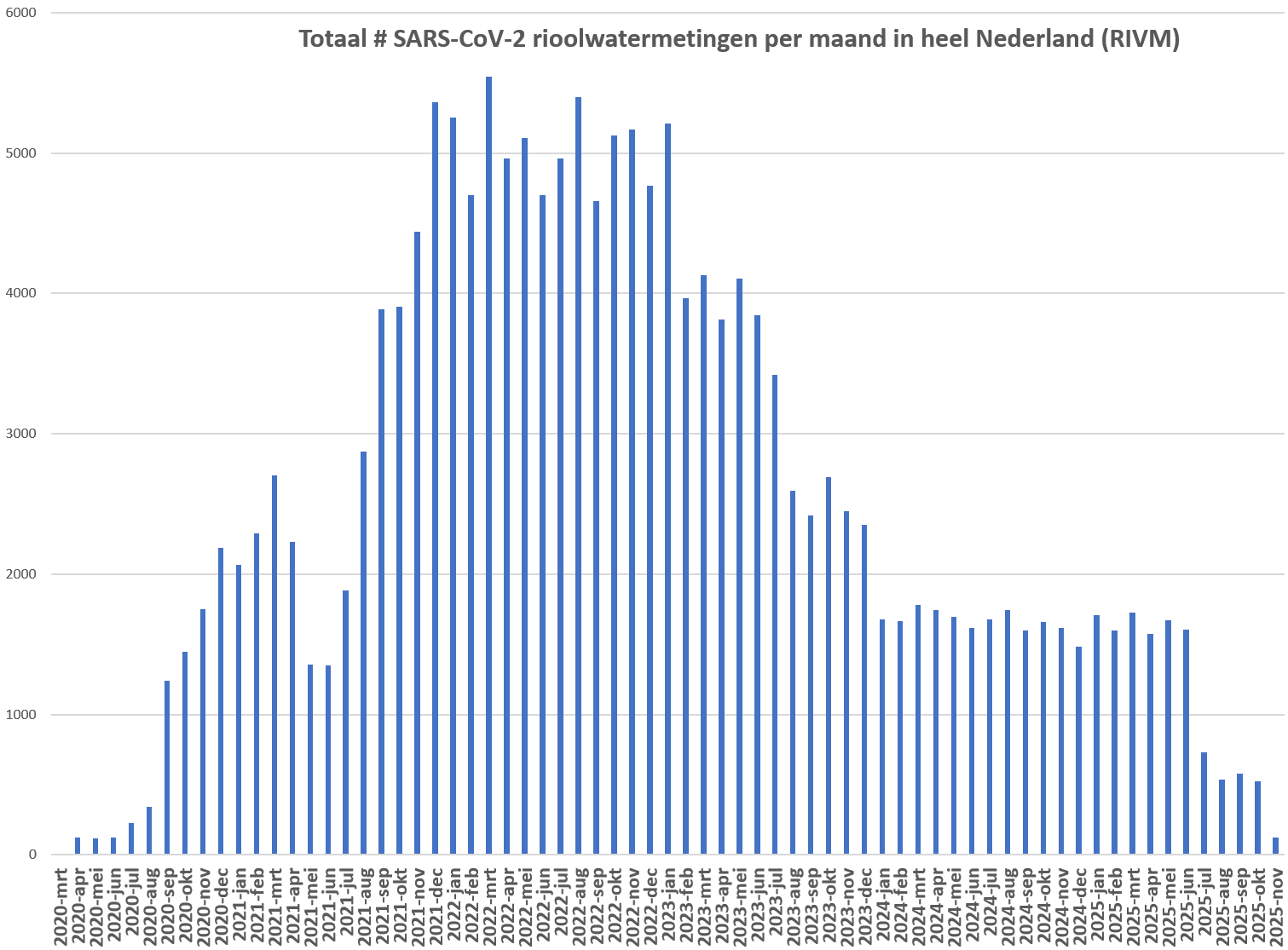 Ter illustratie van de sterke daling van het aantal rioolwatermetingen is in de grafiek hieronder het totaal aantal metingen per maand weergegeven, vanaf maart 2020 tot november 2025. De hoogtijdagen van de rioolwatermetingen waren in 2022: zo’n 5000 metingen per maand over het hele land. Vanaf augustus dit jaar is daar nog maar een fractie van overgebleven, namelijk zo’n 500 metingen per maand.