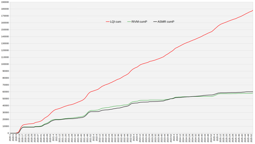 In onderstaande grafiek tenslotte hebben we de cumulatief positieve oversterfte van 2020-2025 uitgezet voor LQI, ASMR en RIVM, dat is de totale oversterfte vanaf week 12 waarbij tijdelijke ondersterfte genegeerd wordt. De totale oversterfte voor LQI is al opgelopen 178.349, voor een belangrijk deel te wijten aan de vergrijzing, de na-oorlogse geboortegolf die nu tegen de 80 loopt. De grafieken voor ASMR en RIVM lijken elkaar niet veel te ontlopen, maar het verschil zal in de loop van de jaren ongetwijfeld steeds verder oplopen. De cumulatief positieve oversterfte volgens ASMR is inmiddels opgelopen tot 60.374.