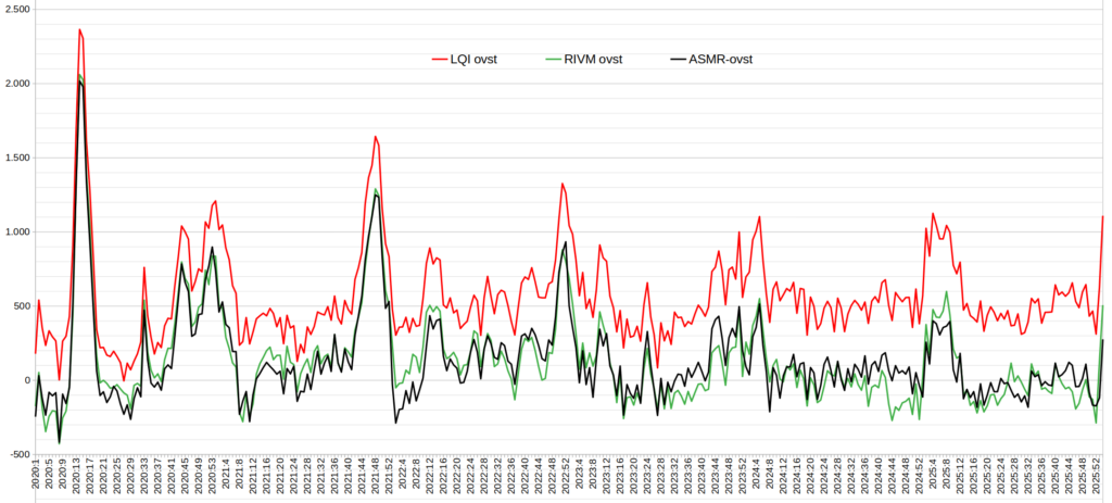 De RIVM-oversterfte is niet gevoelig voor de effecten van de vergrijzing, omdat de sterfte vergeleken wordt met de verwachte sterfte o.b.v. de voorafgaande 5 jaar, dus inclusief continue coronasterfte. We zien dan ook dat er belangrijke verschillen optreden tussen ASMR en RIVM, vooral in perioden dat er veel covid rondgaat. Zoals in de herfst van 2024 en 2025 het geval was.