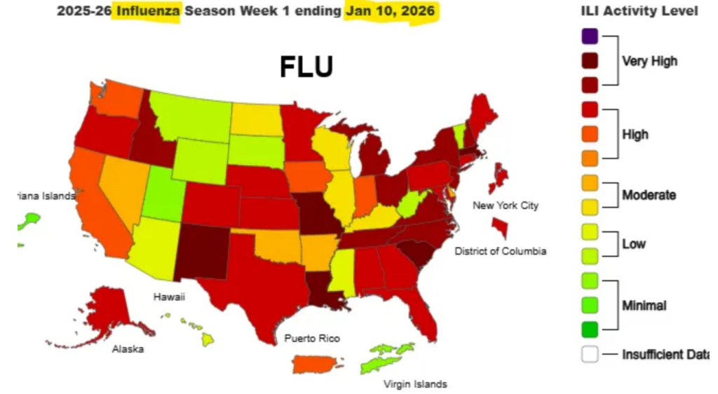 In de wekelijkse nieuwsbrief van Dr. Ruth Ann Crystal wordt de status van de verspreiding van influenza in de VS op 10 januari getoond. Veel staten hadden een hoge tot zeer hoge prevalentie van influenza. In het VK is de griepgolf wel voorbij, maar het is onvermijdelijk dat we in Nederland alsnog een echte griepgolf krijgen, tenzij we steviger gaan inzetten op preventie!