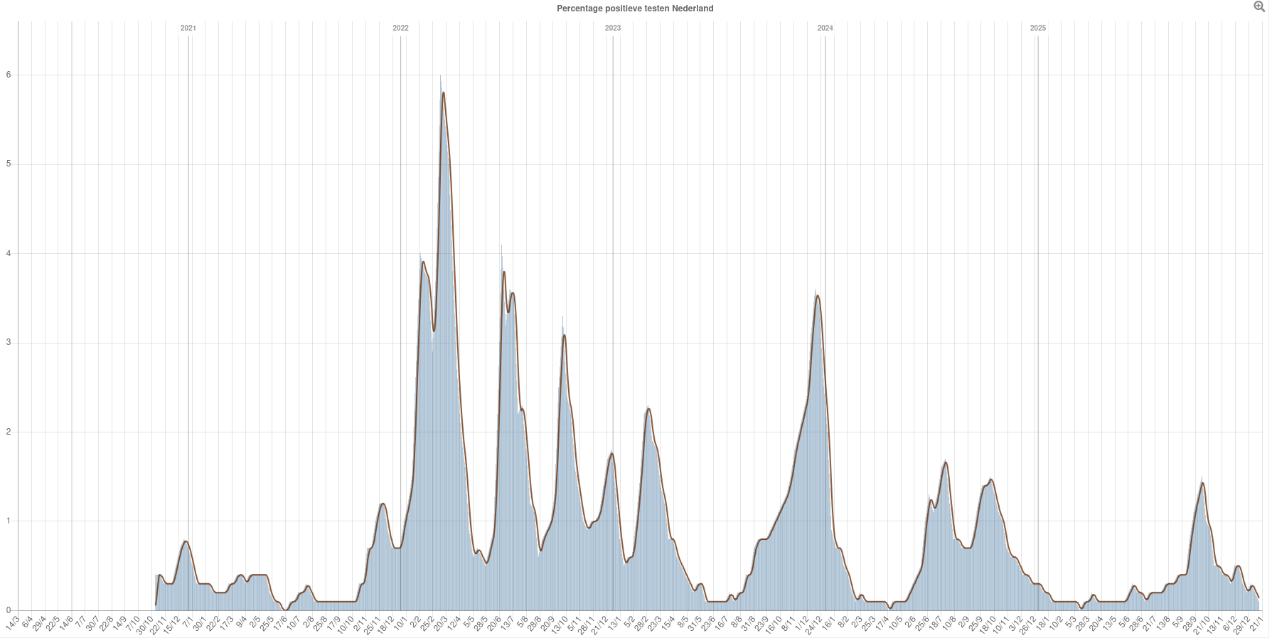 Het percentage op Covid19 positief geteste mensen wordt ook bijgehouden in de RIVM-testgroep voor registratie van luchtweginfecties (infectieradar). Dit percentage positieve Covid19-testen in Nederland wordt sinds augustus 2024 ook in grafiekvorm gepubliceerd op Corona-lokaal: