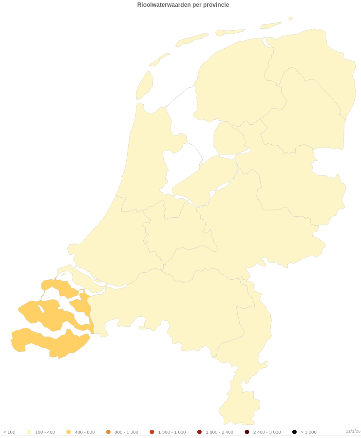 Op Corona Lokaal is ook de landelijke spreiding van het coronavirus te zien, over de provincies en over de afvalwaterstations. Er is nu nog maar één donkergeel gekleurde provincie met een rioolwaarde tussen 400 en 800, namelijk Zeeland. In alle andere provincies is de rioolwaarde onder de 400 gezakt.
