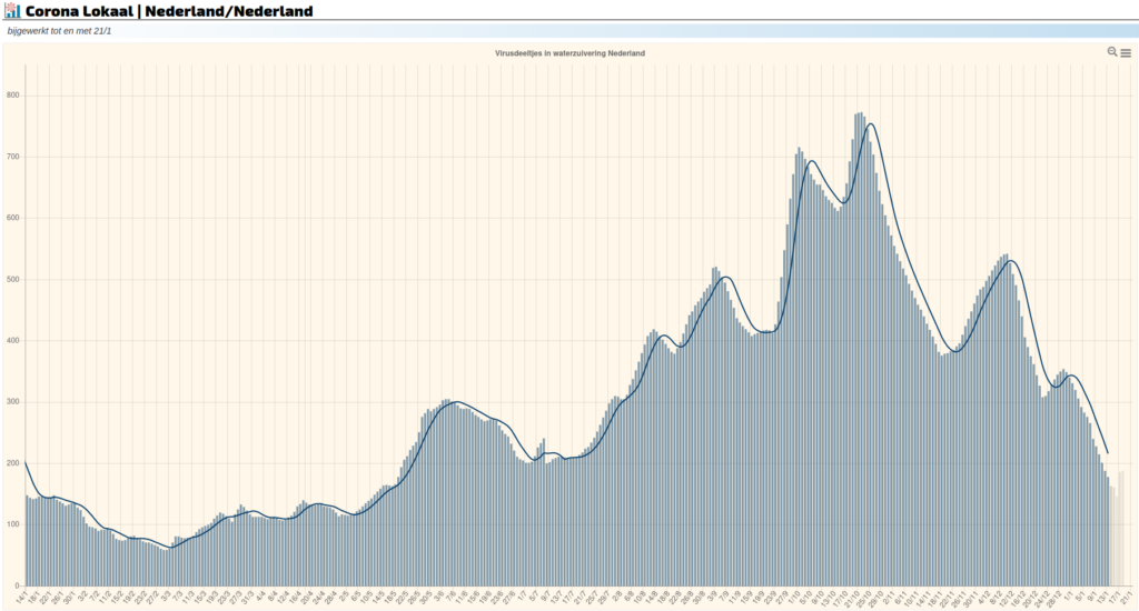 Meting 13 januari: 178 (x 1011 virusdeeltjes per 100.000 inwoners) volgens Corona Lokaal, gebaseerd op rioolwatermetingen van het RIVM. Sinds vorige week zijn er wel 15 dagen met betrouwbare gegevens bijgekomen! Ook de rioolwatermetingen zijn dus behoorlijk vertraagd in de kerstvakantie.