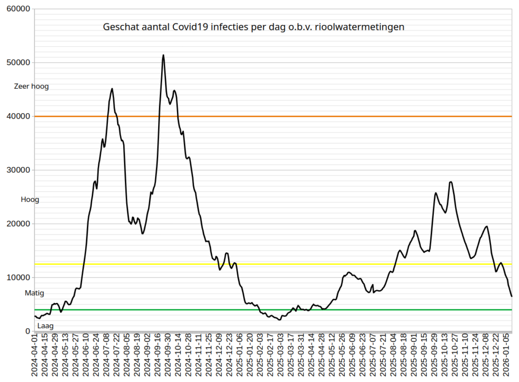 Op basis van rioolwatermetingen is het besmettingsrisico Covid19 Matig nu, het aantal infecties per dag in Nederland op 13 januari wordt geschat op 6400, en is daarmee aan een flinke duikeling begonnen. Het begint erop te lijken dat de lange slopende coronagolf sinds augustus 2025 eindelijk gaat uitsterven. Dat is goed nieuws, want elke Covid-(her)infectie kan nog steeds leiden tot langdurige klachten, óók als die infectie (vrijwel) zonder symptomen verloopt.