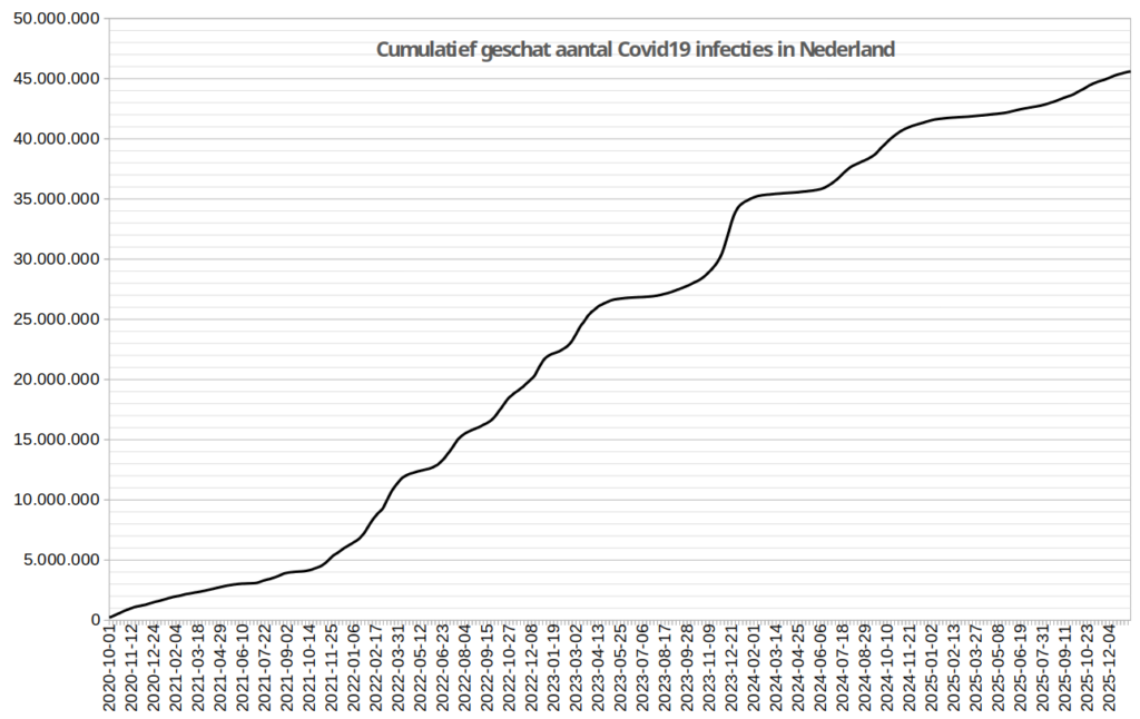 Hier is bijvoorbeeld uit af te lezen dat pas in november 2022 Nederlanders gemiddeld 1x besmet waren, maar óók dat nu al 45,6 miljoen besmettingen een feit zijn, zodat nu, ruim 3 jaar later, Nederlanders al gemiddeld ruim 2,5x besmet zijn geweest. Vergelijk dat eens met de griep: de meeste mensen krijgen hooguit één keer in de 5 of 10 jaar griep, terwijl Covid19 nog steeds gevaarlijker én besmettelijker is dan influenza. Overigens kan het gemiddelde aantal Covid19-besmettingen sinds 2020 in werkelijkheid nog flink wat hoger uitpakken, omdat bijna de helft van de besmettingen zonder duidelijke symptomen verloopt. Terwijl deze asymptomatische besmettingen evengoed tot Long Covid kunnen leiden!