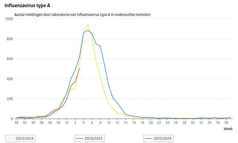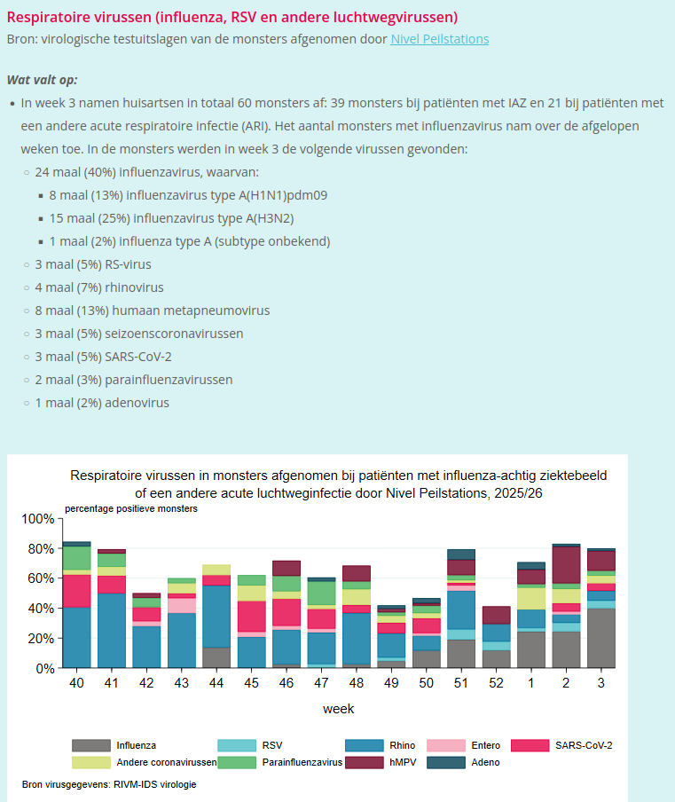 In het Nivel Surveillance Bulletin van 2026 week 3 wordt de status van veel infectieziektes in NL belicht. In week 1 werden 60 monsters afgenomen, waarvan 48 positief waren: 24x influenza (waarvan 15x type H3N2), 4x rhinovirus, en 3x RSV, zie onderstaande schermafdruk. Het aantal onderzochte monsters is weer goed op peil na de kerstperiode en influenza neemt kennelijk flink toe nu.