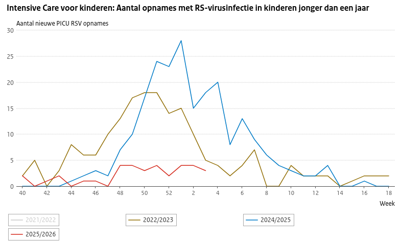Afgelopen herfst is men begonnen met het immuniseren van baby’s van 0 tot 6 maanden, juist omdat RSV voor deze groep zo gevaarlijk is en kan leiden tot opname op de IC en in een enkel geval zelfs tot overlijden. De prik bevat geen vaccin, maar antistoffen, zodat nauwelijks bijwerkingen verwacht worden. Het effect van deze immunisatiecampagne is in de grafiek hierboven niet goed te zien, maar dat wordt wel duidelijk uit onderstaand overzicht van het aantal opnames van kinderen tot een jaar op de Intensive Care. Dat is beduidend lager dan vorige jaren.