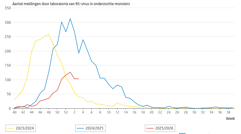 Het RS-virus is de laatste 2 maanden weer aan een opmars begonnen, zoals blijkt uit meldingen uit Nederlandse laboratoria. De golf is duidelijk minder heftig dan vorige jaren.