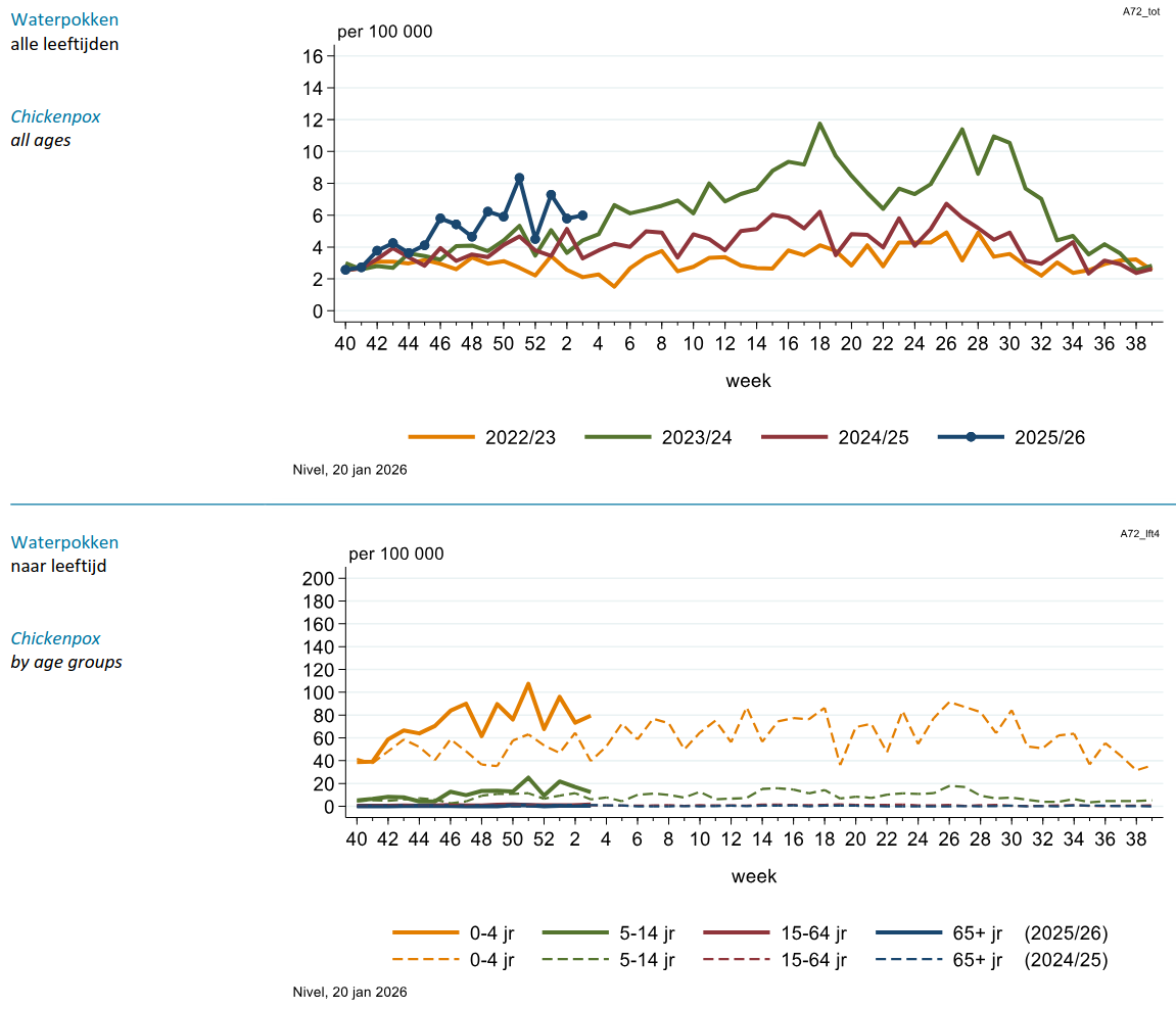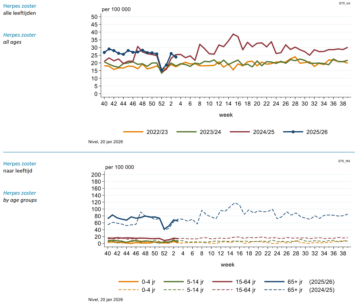 Na de gebruikelijke eindejaarsdip in het aantal meldingen bij Nivel in week 52 en week 1 is de prevalentie van Herpes zoster in week 2 en 3 weer op het – duidelijk verhoogde – niveau van 2025 gekomen.