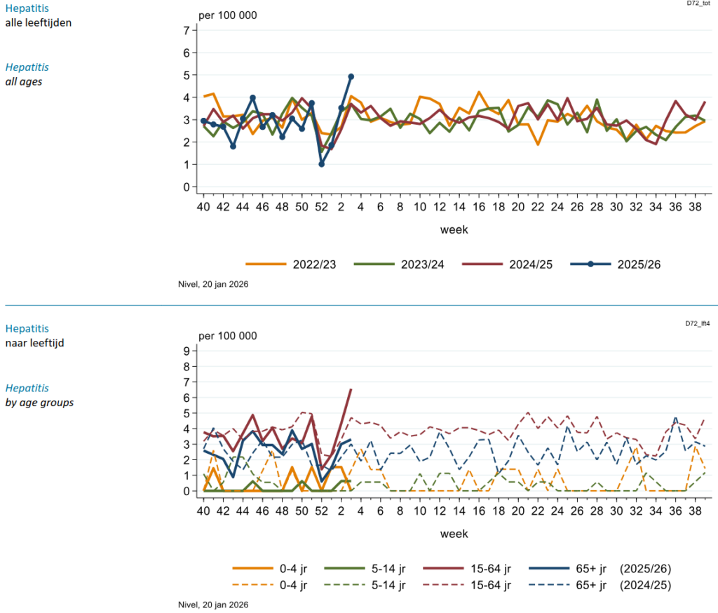 Ook wil ik deze keer het plotseling verhoogde aantal meldingen van hepatitis noemen. Misschien is het een eenmalige toevallige uitschieter, maar het kan ook de aanzet tot een echte uitbraak zijn.