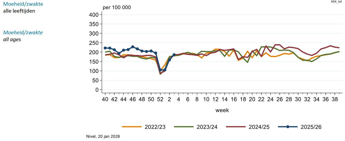 Tenslotte melden we nog het groeiend aantal klachten bij de Nivel huisartsen over moeheid en zwakte de afgelopen jaren. Ook dit lijkt elk jaar toe te nemen, vooral in de zomermaanden. Sinds het begin van deze zomer ligt het aantal klachten bij huisartsen tot wel 30% hoger dan in vorige jaren. Ook hier is een flinke dip te zien in de kerst- en nieuwjaarsweek. Het aantal meldingen is nog niet op het verhoogde niveau van afgelopen herfst uitgekomen. Even afwachten hoe dat verder gaat.