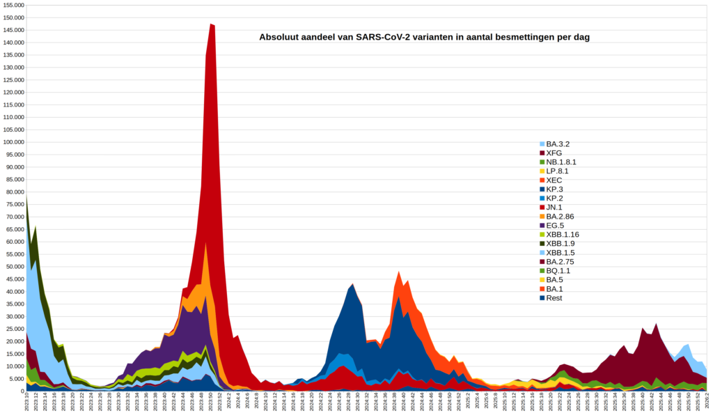 Ook maakt deze grafiek duidelijk dat de najaarsgolf van 2025 grotendeels op het conto van recombinant XFG is te schrijven. Nieuwe variant BA.3.2 blijkt slechts een marginale rol te spelen: deze kon in de nadagen van XFG opkomen omdat hij de tegen XFG opgebouwde immuniteit kon ontwijken. BA.3.2 is in absolute zin echter niet besmettelijk genoeg om een nieuwe golf in te luiden. Nog niet althans, maar wie weet is deze variant later alsnog in staat om nog wat “gunstige” mutaties op te doen.