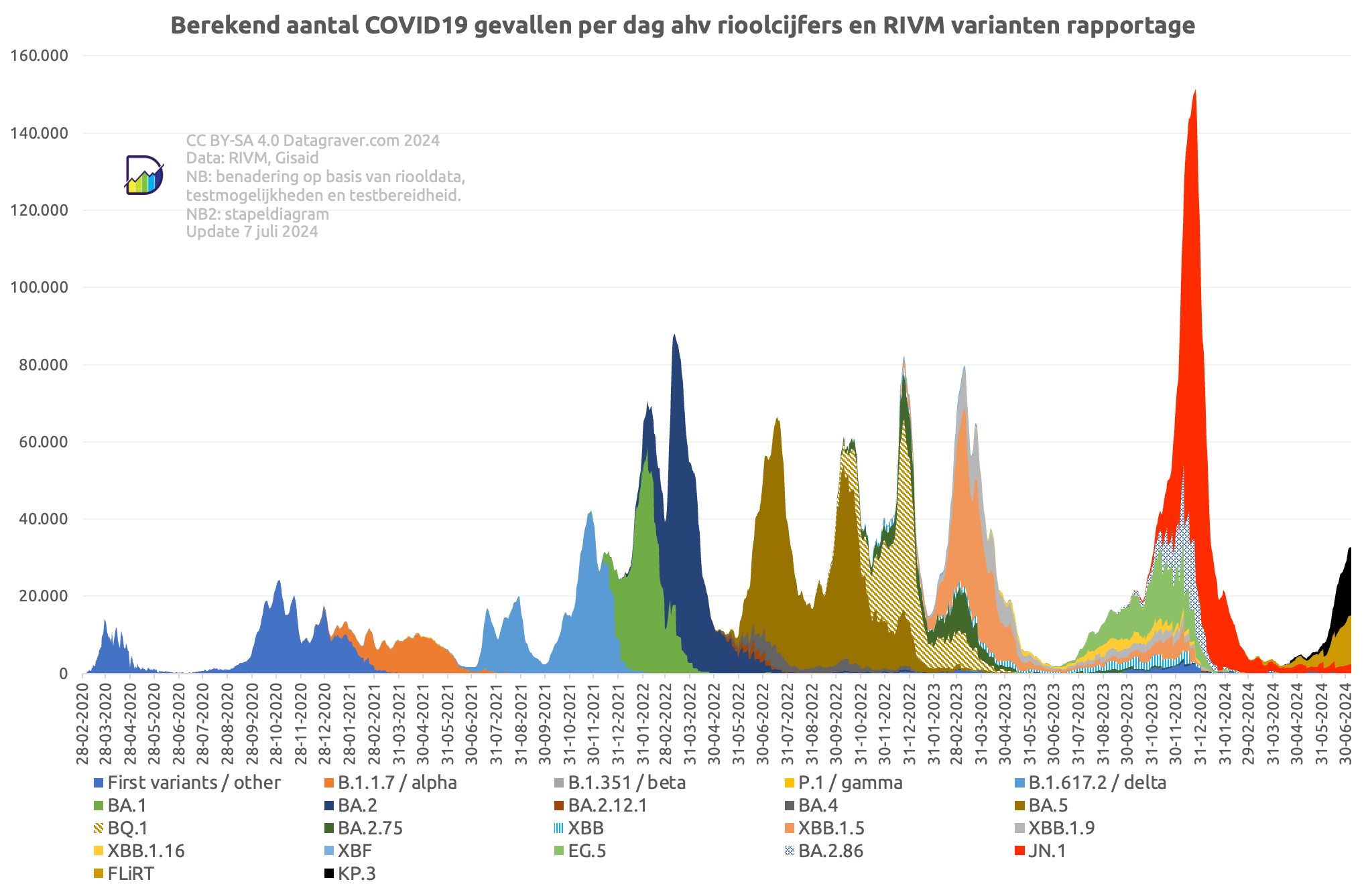 Hierin is goed te zien dat de enorme herfst-wintergolf in 2023 toe te schrijven is aan variant JN.1, die sterk opkwam uit een “variantensoep” van wel 5 verschillende varianten XBB.1.5, XBB.1.9, XBB.1.16, EG.5 en BA.2.86 (de directe voorganger van JN.1). KP.3 was verantwoordelijk voor de zomergolf van 2024. Deze brak af door de zomervakantie (minder verspreiding door school en werk), maar kwam terug toen de scholen weer openden en zorgde samen met recombinant XEC voor een najaarsgolf.