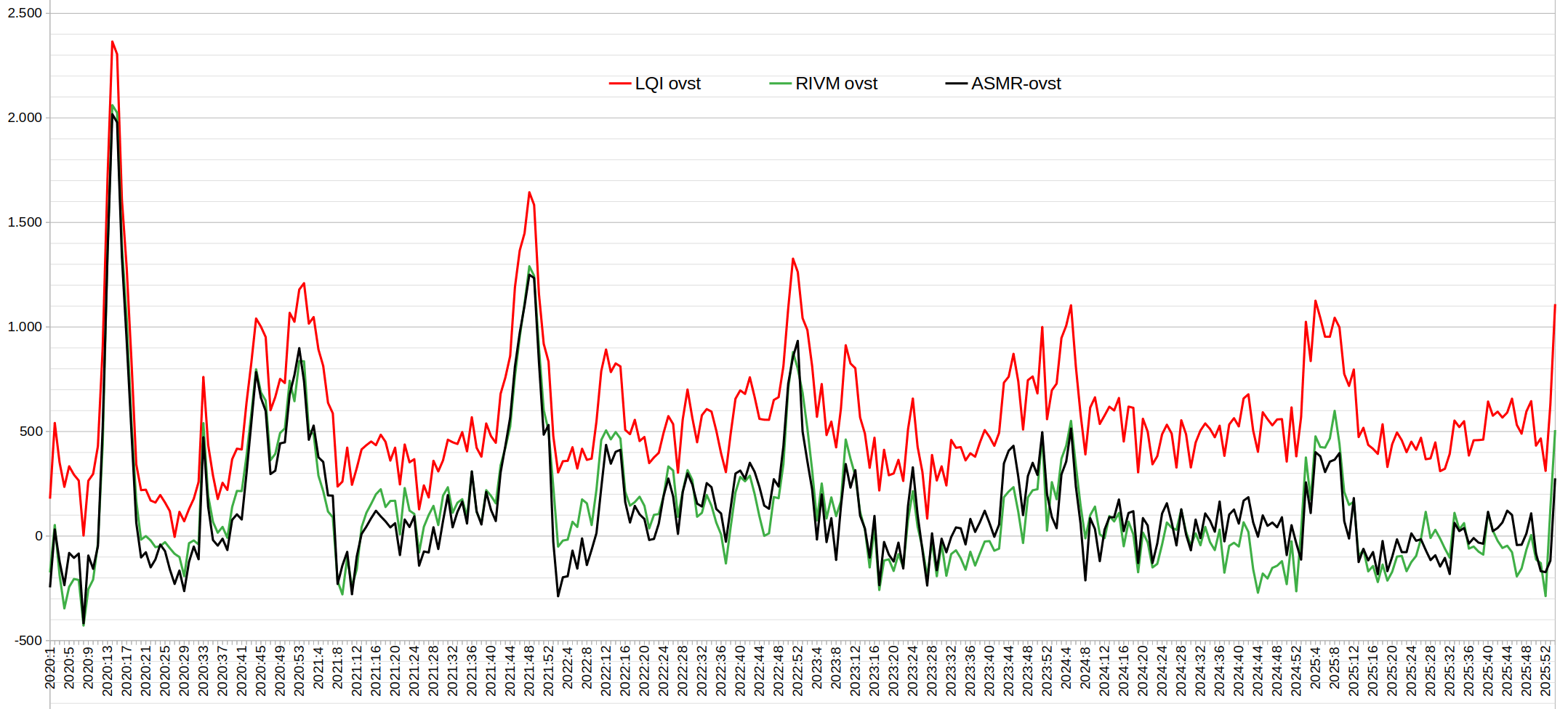 In onderstaande grafiek wordt de totale ASMR-oversterfte vergeleken met het oversterfteverloop volgens het RIVM en ons oversterfteverloop o.b.v. vergelijking met het laagste kwartiel van sterfte in periode 2010-2019 (LQI).