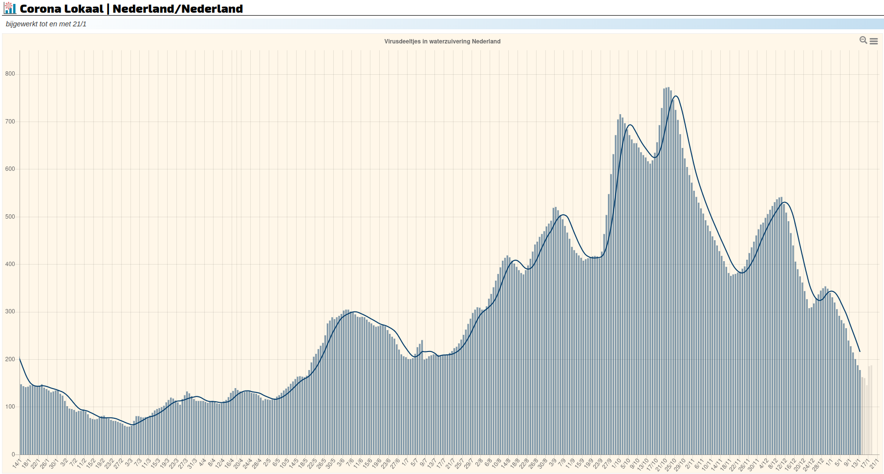 Meting 13 januari: 178 (x 1011 virusdeeltjes per 100.000 inwoners) volgens Corona Lokaal, gebaseerd op rioolwatermetingen van het RIVM. Sinds vorige week zijn er wel 15 dagen met betrouwbare gegevens bijgekomen! Ook de rioolwatermetingen zijn dus behoorlijk vertraagd in de kerstvakantie.