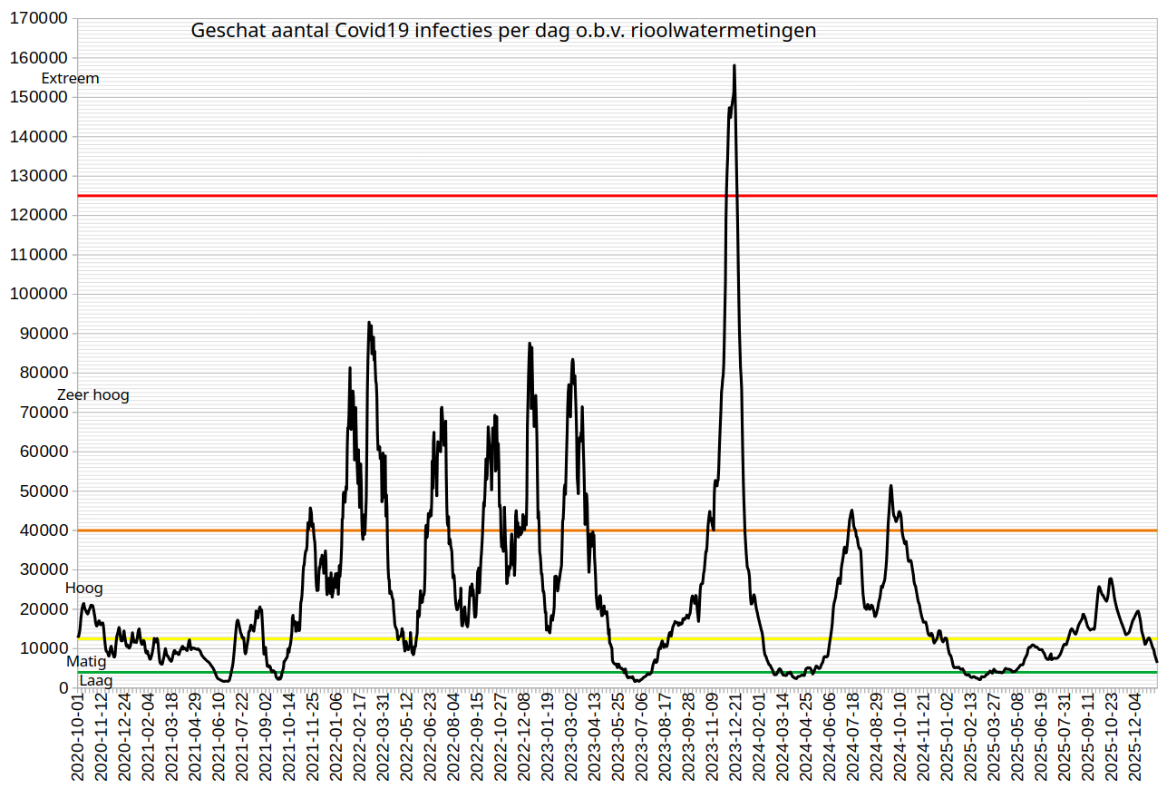 Geschat aantal Covid19 infecties per dag in Nederland, afgeleid uit het aantal virusdeeltjes in rioolwater (data van RIVM, analyse van Corona Lokaal) met factor 36, van 1-10-2020 t/m 13-1-2026.