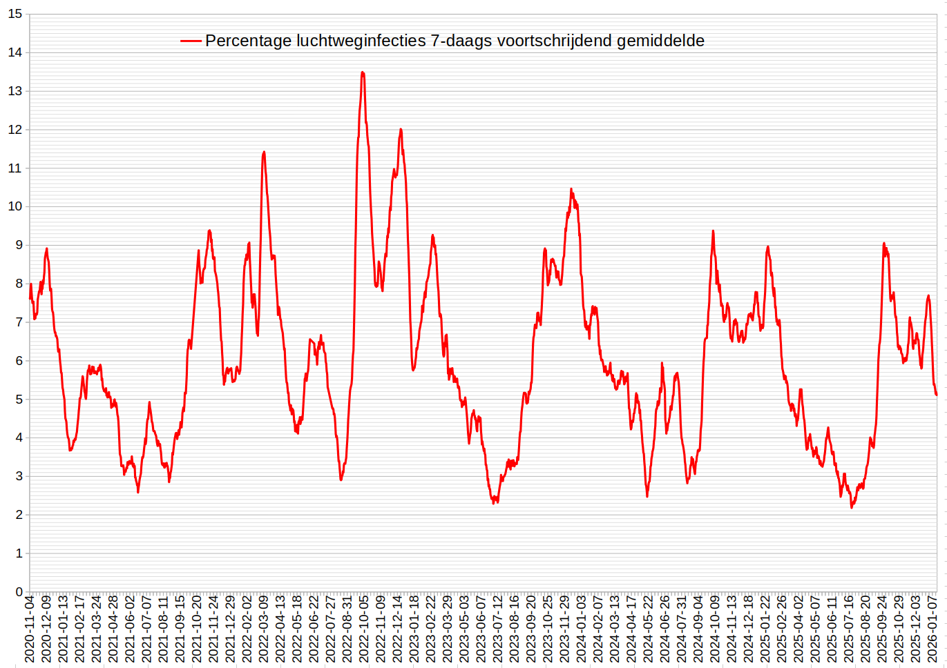 Percentage van de NL bevolking met een acute luchtweginfectie van 4-11-2020 tot 3-1-2026, o.b.v. het voortschrijdend weekgemiddelde van meldingen aan RIVM