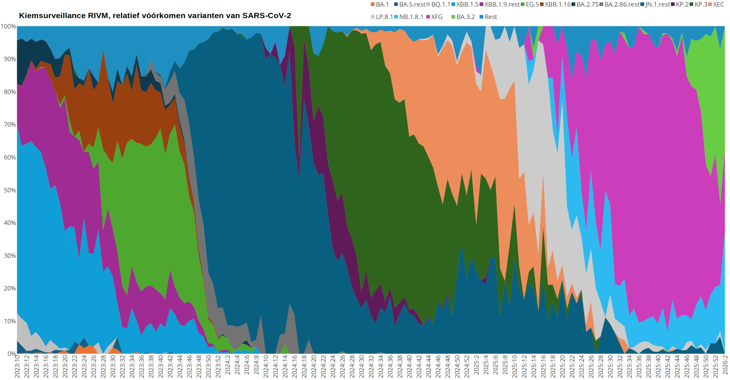 Hierin zijn de meeste coronagolven op een eenduidige manier te identificeren met een bepaalde dominante variant. De grafiek stopt echter halverwege 2024. In onderstaande grafiek wordt nu weergegeven hoe het verder ging, vanaf 2023 week 10 tot heden, 2026 week 2.