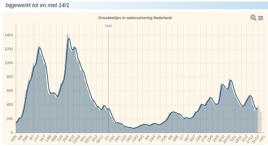 Op 28 december werden er 380x10e11 virusdeeltjes per 100 duizend inwoners in het riool gevonden (grafiek hieronder van corona-lokaal.nl). Dit komt overeen met rond de 14 duizend besmettingen. Er zijn nog geen voldoende betrouwbare metingen uit 2026.