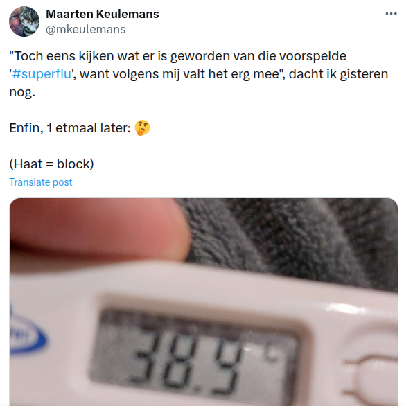 Een van de zieken is Maarten Keulemans, wetenschapsredacteur bij de Volkskrant. Zonder test weten we natuurlijk niet of hij griep of een andere infectie heeft.